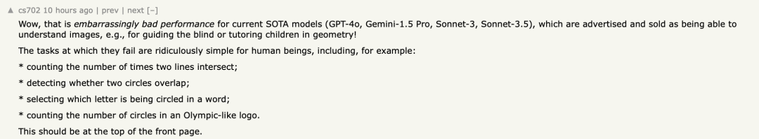 一位网友表示:「SOTA 模型们(GPT-4o,Gemini-1.5 Pro,Sonnet-3,Sonnet-3.5)表现得如此糟糕真是令人尴尬,而这些模型居然在宣传时还声称:它们可以理解图像?例如它们可以用于帮助盲人或辅导儿童几何学!