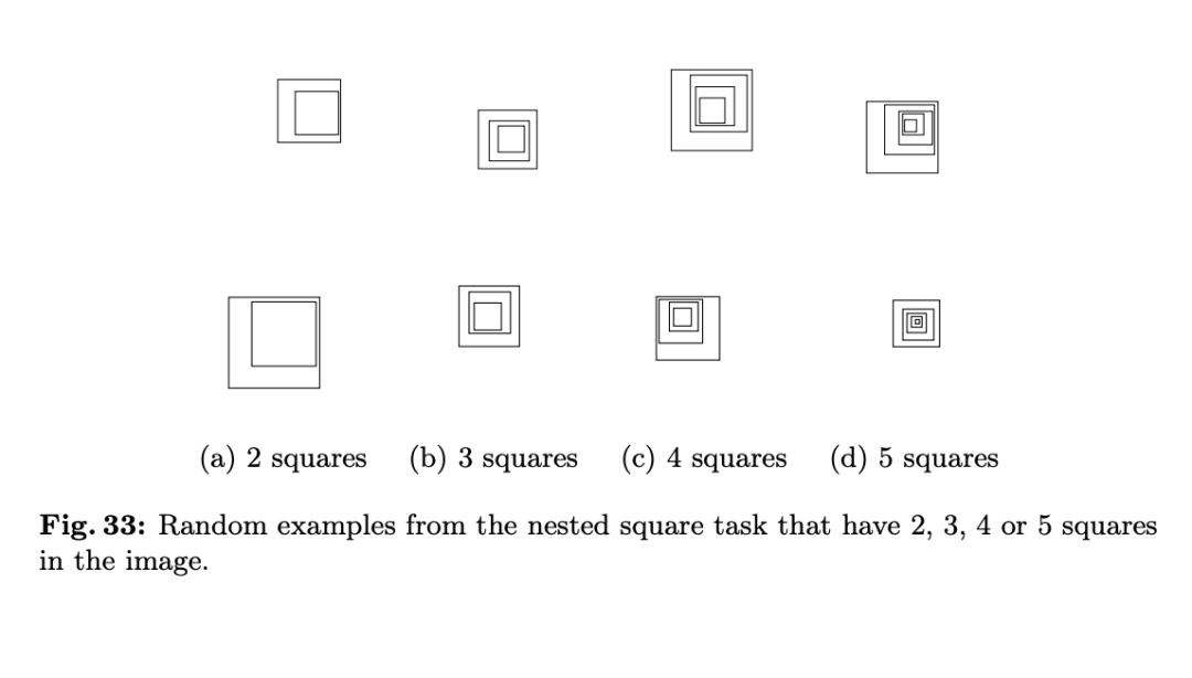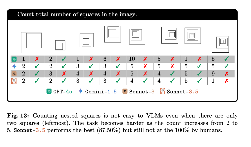 由于 VLMs 计算相交圆圈的数量时表现不佳,论文作者进一步测试了当图案的边缘不相交,每个形状完全嵌套在另一个形状内部的情况。他们用 2-5 正方形生成了「套娃」式的图案,并让 VLMs 计算图像中的正方形总数。