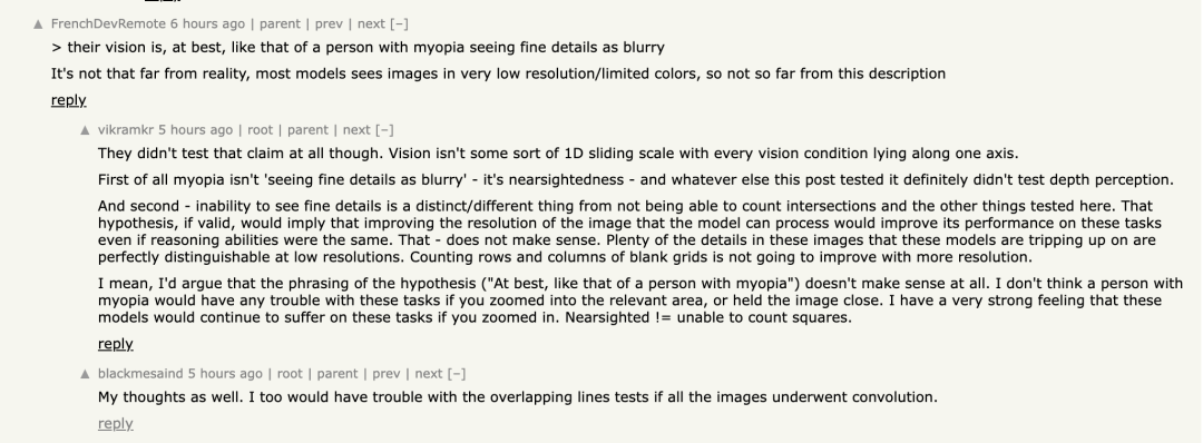 有网友认为,这篇论文的测试并不能说明 VLMs「近视」。首先近视的人看细节并不模糊,「看细节模糊」是远视的症状。其次,看不见细节与不能计算交点的数量是两回事。计算空白网格的行和列的数量的准确率,不会因为分辨率的提高而提高,而提高图像的分辨率对于理解这个任务并没有帮助。此外,提高图像分辨率对于理解这个任务中的重叠线条或交叉点并不会产生显著影响。