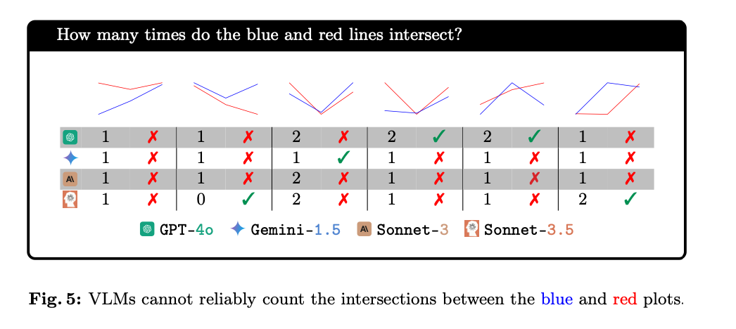 让现在最火的 SOTA 模型们(GPT-4o,Gemini-1.5,Sonnet-3,Sonnet-3.5)数一数两条线有几个交点,他们表现会比人类好吗?