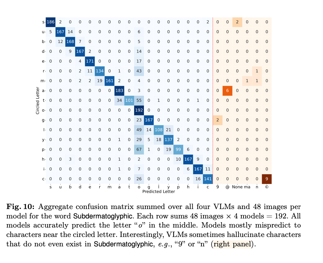 例如,当字母被红圈轻微遮挡时,视觉语言模型往往会出错。它们经常混淆红圈旁边的字母。有时模型会产生幻觉,例如,尽管能够准确拼写单词,但会给单词中添加(例如,「9」,「n」,「©」)等乱码。