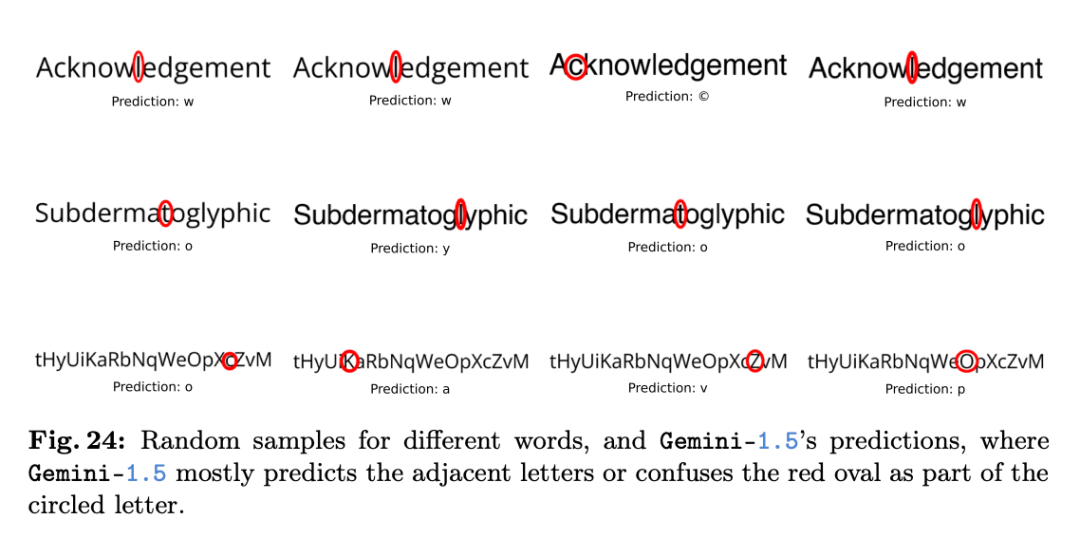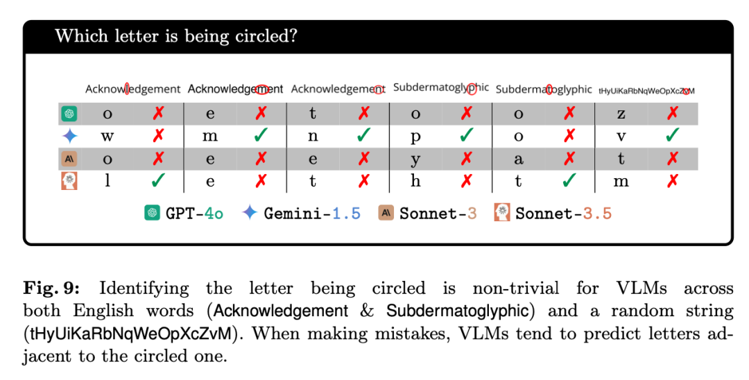 由于一个单词间字母之间的间隔很小,论文作者们假设:如果 VLMs「近视」,那么它们是没办法识别出被红圈圈出的字母的。