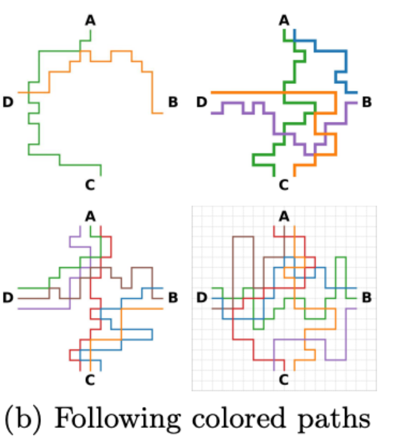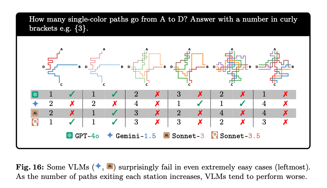 这项测试检测的是 VLMs 跟随路径的能力,这对于模型解读地图、图表以及能否理解用户在输入的图片中添加的箭头等标注至关重要。为此,论文作者随机生成了 180 幅地铁线路图,每张图有四个固定的站点。他们要求 VLMs 计算两个站点之间有多少条单色的路径。