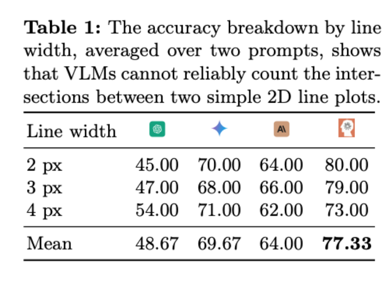 该结果与 VLMs 在 ChartQA 上的高准确率形成鲜明对比,这表明 VLMs 能够识别线图的整体趋势,但无法「放大」以看到类似于「哪些线条相交了」这种细节。