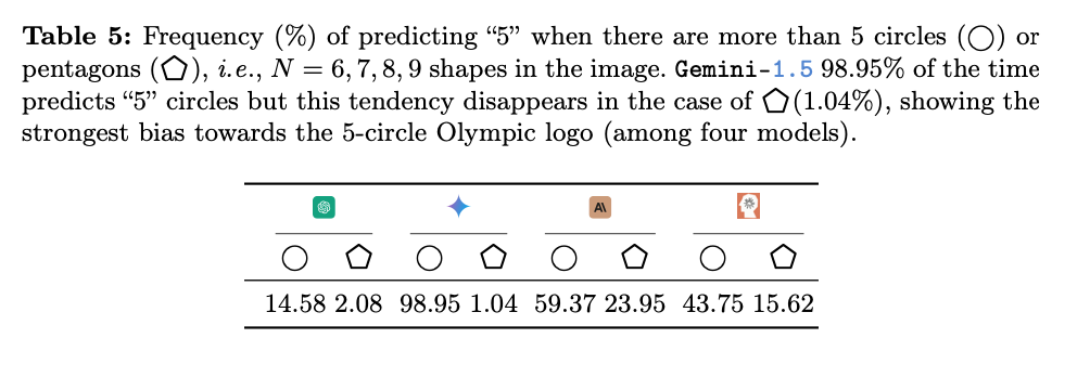 这表明,VLM 存在偏见,它们更倾向于输出著名的「奥运五环」作为结果。例如,无论实际圆的数量是多少,Gemini-1.5 都会在 98.95% 的试验里将结果预测为「5」(见表 5)。对于其他模型,这种圆环预测错误出现的频率也远高于五边形的情况。