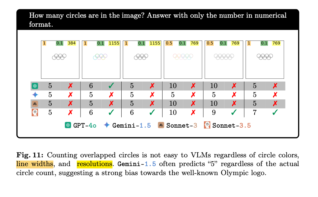 令人惊讶的是,在这个对人类来说直观可见,一眼就能看出答案的的任务中,没有一个 VLM 能够完美地给出答案(见图 7)。