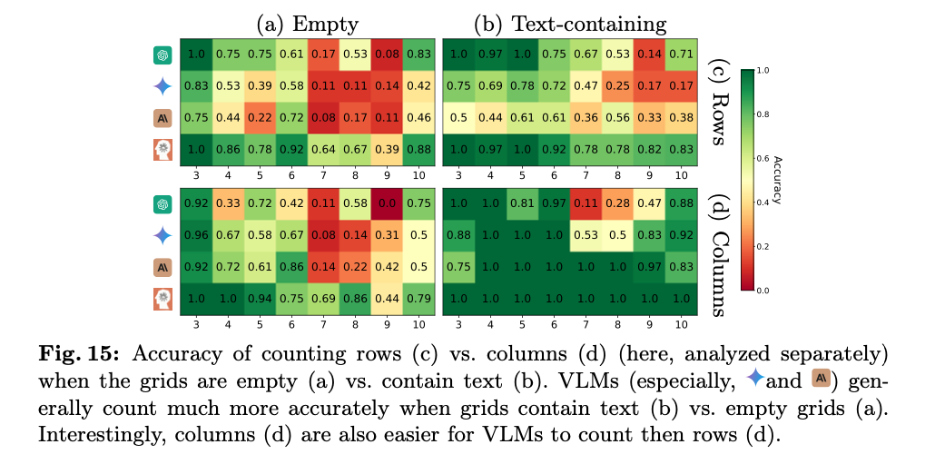 而大多数模型(Gemini-1.5、Sonnet-3 和 Sonnet-3.5)在计算列数方面的表现始终优于计算行数(见图 15c 和 d)。