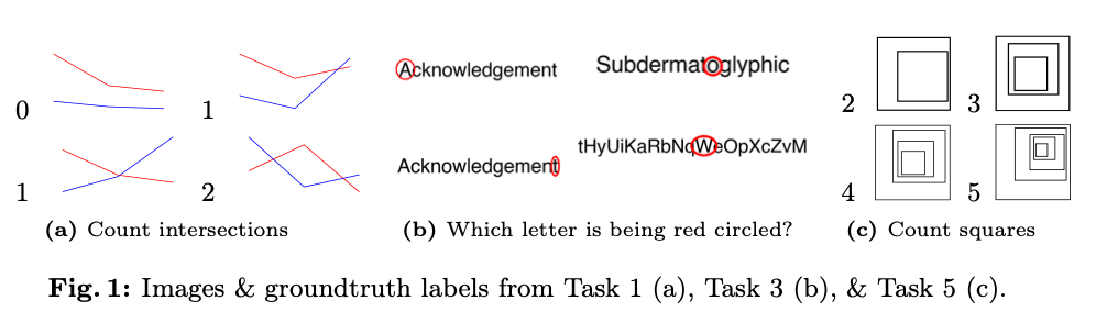 这套题很简单,例如,数两条线有几个交点,识别是哪个字母被红圈标出来了,几乎不需要任何世界知识。测试结果令人震惊,VLMs 实际上都「近视」,图片的细节在它们看来实际是模糊的。