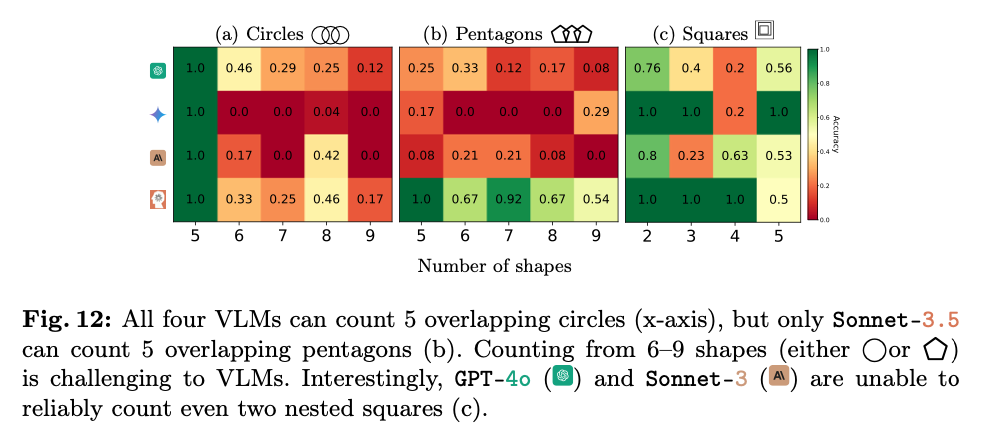 然而,在计算五边形时,所有 VLM(除 Sonnet-3.5 外)即使在计算 5 个五边形时也表现不佳。总体来看,计算 6 到 9 个形状(包括圆和五边形)对所有模型来说都是困难的。