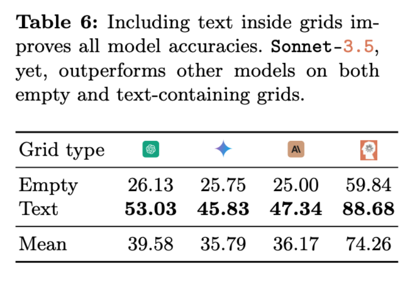 这可能是因为文档中的表格大多是非空的,而 VLM 不习惯空表格。有趣的是,在研究人员通过尝试在每个单元格中添加一个单词来简化任务后,观察到所有 VLM 的准确率显著提高,例如,GPT-4o 从 26.13% 提高到了 53.03%(见表 6)。然而,这种情况中,被测模型的表现依旧不完美。如图 15a 和 b 所示,表现最好的模型(Sonnet-3.5)在包含文本的网格中表现为 88.68%,而在空网格中表现为 59.84%。
