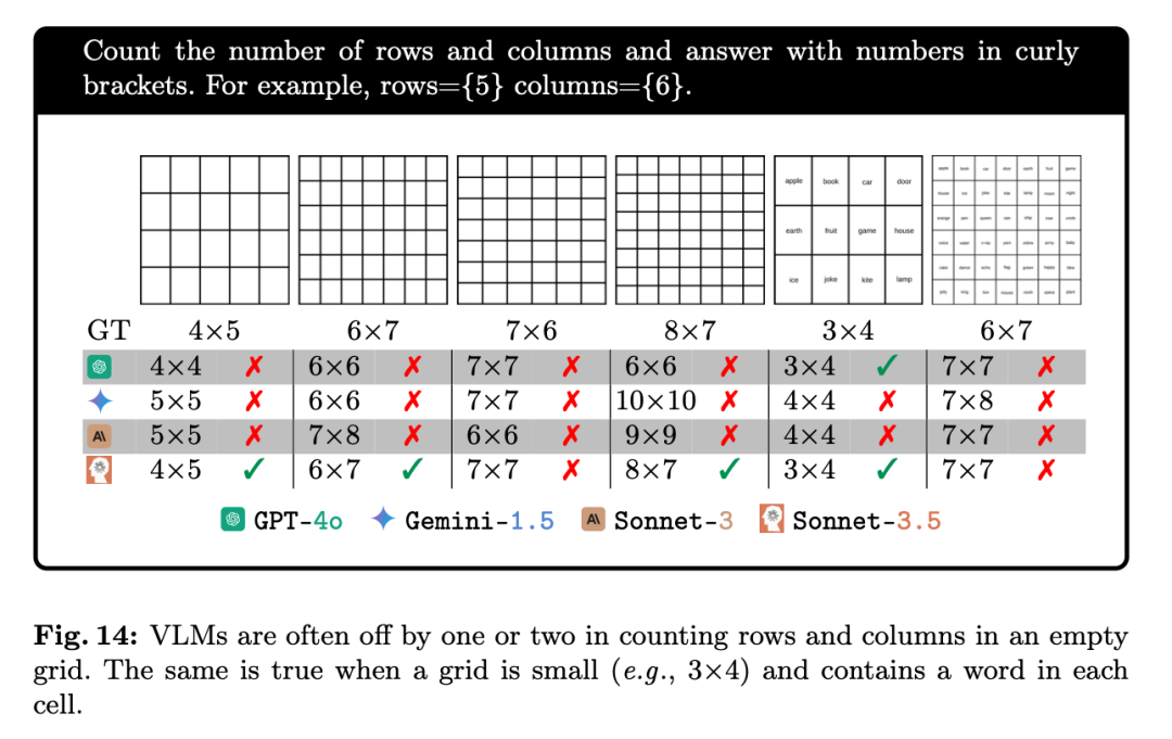 具体来说,它们通常会存在 1-2 格的偏差。如下图所示,GPT-4o 把 4×5 的网格认成了 4×4,Gemini-1.5 则认成了 5×5。