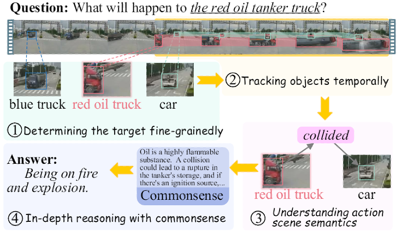 当人类拿到这个题目的视频,首先,我们会根据问题确定感兴趣的目标,即红色油罐卡车。然后,我们会仔细观看视频,跟踪目标对象在视频中的动作语义。接着,我们会进行一些深入和高层次的推理,可能会结合一些常识知识。最后,我们给出推理答案:“可能会着火甚至爆炸。”