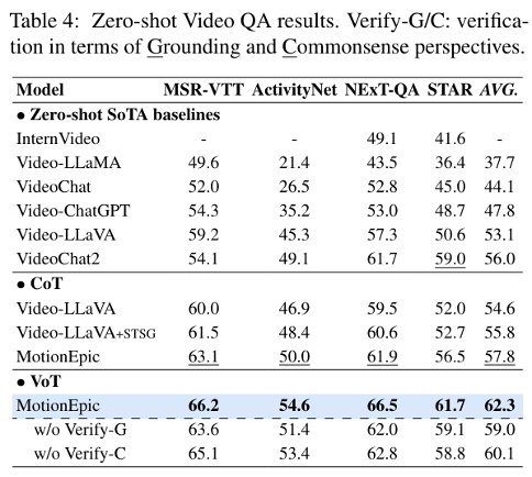 实验结果表明,作者提出的全新推理框架可显著提升模型在各类视频QA上的性能,超越了当前所有传统视频MLLM以及CoT方法的表现。