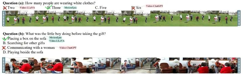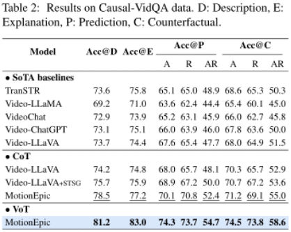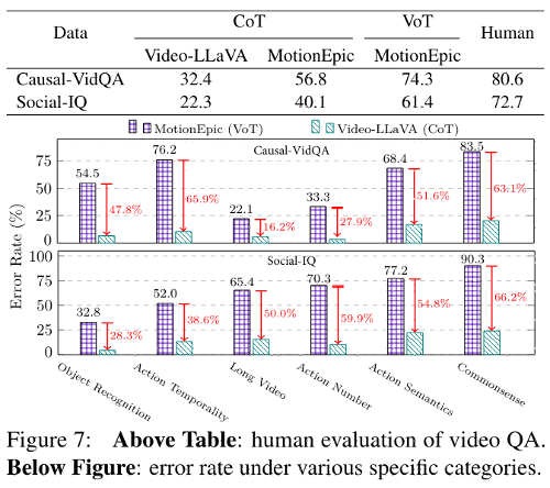 首先,作者进行了人类评估。如图7上表所示,使用VoT推理框架的MotionEpic取得了相当出色的结果,甚至可以与人类表现相媲美。进一步,作者总结了六种常见的错误案例,并分析六种最常见错误类别的差异。如图下部分所示,MotionEpic(使用VoT)显著降低了VideoLLaVA(使用CoT)的错误率,特别是在动作语义和常识理解方面。