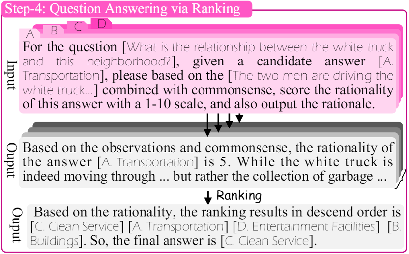 在深入理解了视频中目标行为之后,现在开始回答原始问题。首先,本系统将所有QA问题统一为多项题,即从提供的多个候选答案中选出最终答案。进一步,受人类解答多选题的模式启发,本系统还采用了排名机制来确定最终答案。具体来说,对于每个候选答案,VoT将提示模型根据常识知识评估其可能性(从1到10),并提供相应的理由。最终根据,排名高的候选则为最终回答。