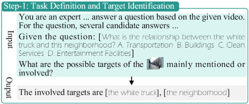 首先,给定输入视频和问题,VoT会识别问题中涉及的所有可能目标。这个过程确保系统明确了解需要分析的对象和相关任务。