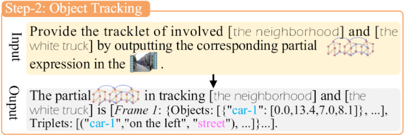 接下来,VoT分析视频内容,追踪问题所涉及的目标行为轨迹,输出感知层面的时空场景图 (STSG)。生成的关于目标轨迹STSG将为下一步行为分析的感知证据。