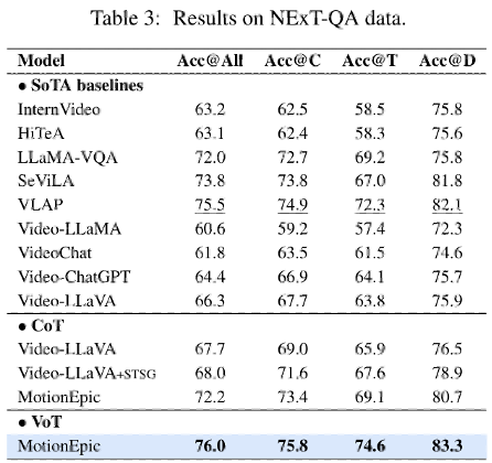 作者首先在多个复杂VideoQA的数据集上进行了测试。实验结果证明VoT在所有的测试集上获得了持续的强于SoTA基线模型的表现,甚至超越传统CoT的性能。