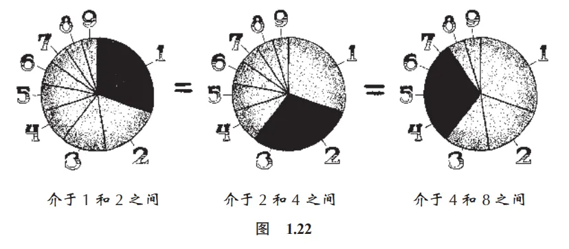 因此,在一张源自任意一种自然现象的数据列表中,介于 1 和 2 之间的数会和介于 2 和 4 之间以及介于 4 和 8 之间的数一样多(图 1.22)。这种现象仅仅是因为数与数的距离在乘法上是相等的,即从一个数到其 2 倍的数的区间。自然而然地,以 1 或 2 开头的数就会比以 7、8或 9 开头的数要多。