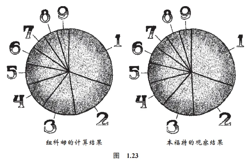基于这一观察结果,西蒙·纽科姆计算出首位数字应当具有的理论分布。幸甚,幸甚!这种理论分布与弗兰克·本福特在五十年后发现的真实分布奇迹般地吻合了(图 1.23)。在理论与具体实验的结果相符时,科学家会感到异常高兴。现在我们可以确信自己清楚地了解了发生的事情。