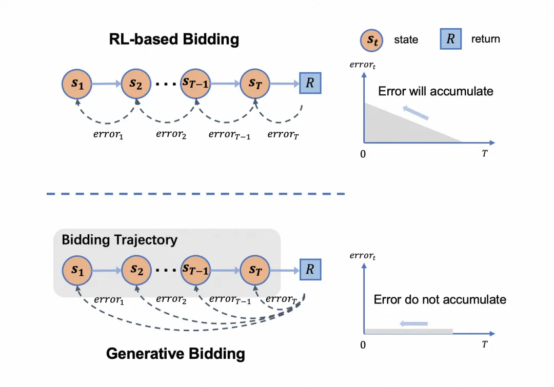 具体来说,AIGB 将出价、优化目标和约束等具备相关性的指标视为一个联合概率分布,从而将出价问题转化为了条件分布生成问题。与强化学习的视角不同,它直接关联决策轨迹和回报信息(如下图所示),能够避免训练误差累积,更适合长序列决策场景。这是联合实验室率先将生成式大模型应用在智能出价领域的一次尝试,相关论文已被国际顶会 KDD 2024 接收。