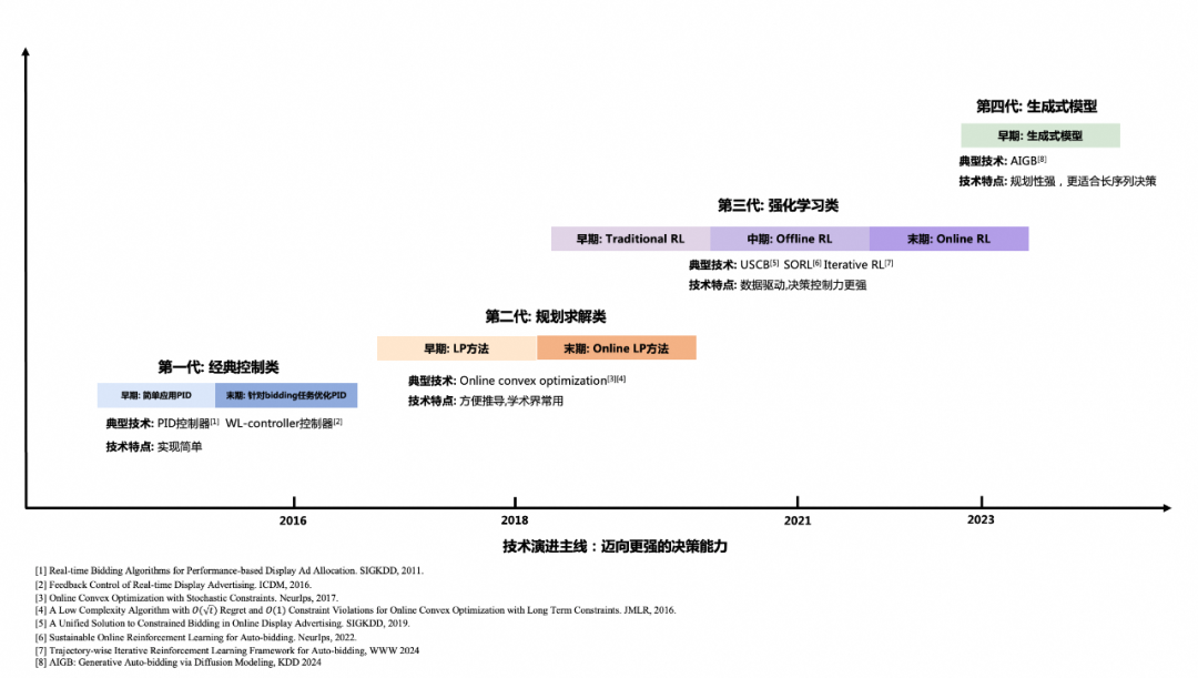 在业界的最新研究处于第三代时(2022年),北大 - 阿里妈妈人工智能创新联合实验室(PAAI)成立。这个实验室集齐了产业界和学术界的多位大牛:北京大学智能学院院长朱松纯教授领衔学术指导,北京大学讲席教授邓小铁、北大智能学院副教授宋国杰和阿里妈妈技术负责人郑波都是实验室的核心成员。几位大牛带领实验室在已有成果的基础上继续研究自动出价等决策智能问题。