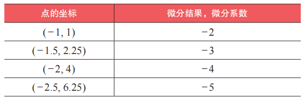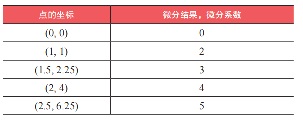 上表显示了二次函数上 5 个特定点处的切线斜率。各点处的切线斜率被称为微分系数。例如,点 (1, 1) 处的微分系数为 2,点 (2.5, 6.25) 处的微分系数为 5。需要再次强调的是,微分系数表示的是特定点处的微分结果。