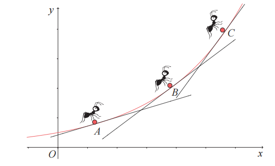 请使用铅笔在普通微分蚂蚁所在的位置处画切线。微分蚂蚁在曲线上移动时感知的倾斜度