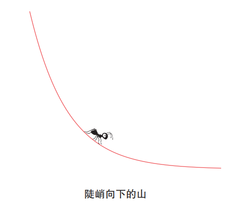 想象一下,有一座像下图一样的山,山上有一只微分蚂蚁正在爬行。与这座山相比,这只虚拟的微分蚂蚁非常小。微分蚂蚁虽然在山上爬行,但是它并不知道山的整体形状。不过,这只微分蚂蚁具有感知山的倾斜度的能力。