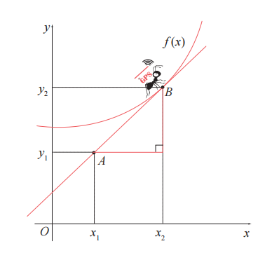 假设我们要在函数 f(x) 上求 B 点处的微分。想象有一条过点 B 的切线,GPS 微分蚂蚁正在该切线上移动。GPS 微分蚂蚁在经过点 A 和点 B 时,能够通过 GPS 准确接收点 A 的坐标