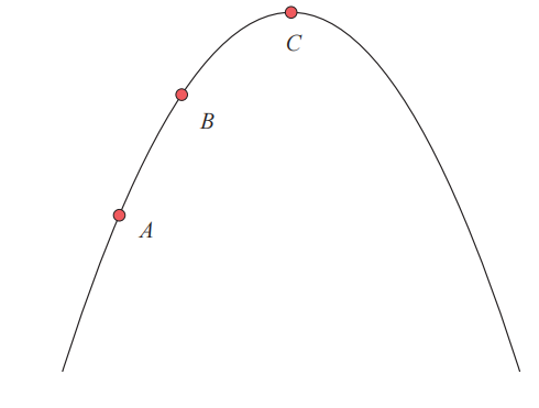 在给定曲线的点 A 和点 B 处,切线的斜率均为正数,点 A 处的切线斜率大于点 B 处的切线斜率。点 C处的切线为水平线,其斜率为 0。