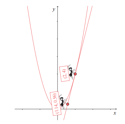 如上图所示,GPS 微分蚂蚁在切线上显示的坐标是 (1.14, 0.56)。现在,GPS 微分蚂蚁可以计算出切线的斜率。因为已经知道两个点的坐标分别是 (2, 4) 和(1.14, 0.56),所以切线的斜率是