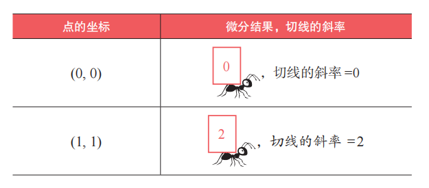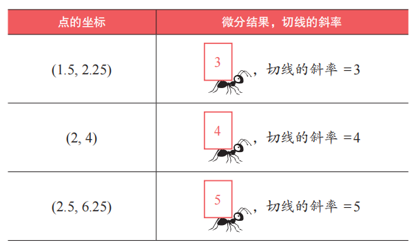 。在这里,4 既是切线的斜率,又是在点 (2, 4) 处求微分的结果。也就是说,我们可以用 4 这一特定的数值来描述 GPS微分蚂蚁在点 (2, 4) 处所感知的倾斜度。