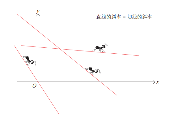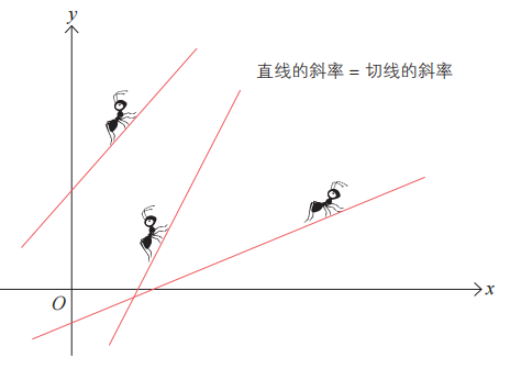 微分蚂蚁在直线上移动时感知的倾斜度微分蚂蚁可以在任何函数图像上爬行。如果要对某个函数求微分,只需将微分蚂蚁放在自己想研究的位置上进行思考即可。微分蚂蚁的故事中出现的大部分函数图像是曲线。不过,也不一定非得是曲线,它有可能是一条直线。将微分蚂蚁放在直线上的情形反而更特别。我们来看下图。