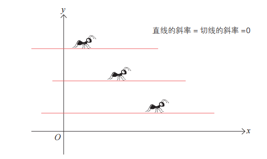 当微分蚂蚁在某条直线上爬行时,试想一下“微分”。此时,微分蚂蚁觉得直线上所有点的倾斜度(切线的斜率)都是一样的。因为直线的斜率本身就是微分蚂蚁感知的倾斜度,切线的斜率也就是直线的斜率。