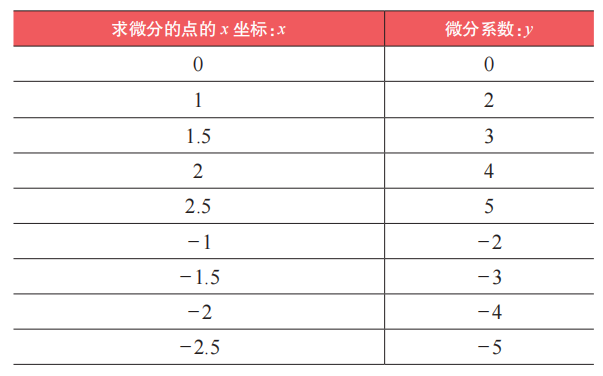 上表中增加了关于 y 轴对称的对称点处的微分系数。对于这些点,无须再次求微分,只需将相应的对称点处的微分系数乘以 -1 即可。现在,我们已经知道了 9 个点处的微分系数。在上表中,已给出的点的 x 坐标保持不变,将其微分系数作为 y 值,组成新的 (x, y),结果如下表所示。