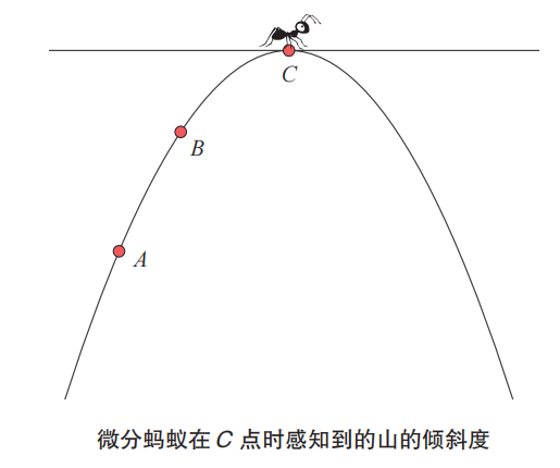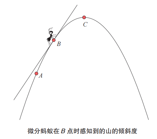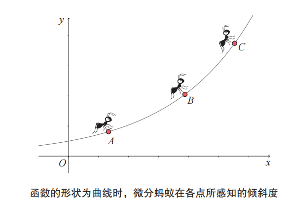 如上所述,微分与曲线上某一点处的切线斜率有关。在这次想象实验中,微分蚂蚁爬行的山的形状是一条光滑的曲线。让我们进一步关注曲线上的 3 个点A、B、C 处切线的斜率。如果从微分蚂蚁的角度来看,用微分的概念来描述曲线的形状,可能的表达方式如下。