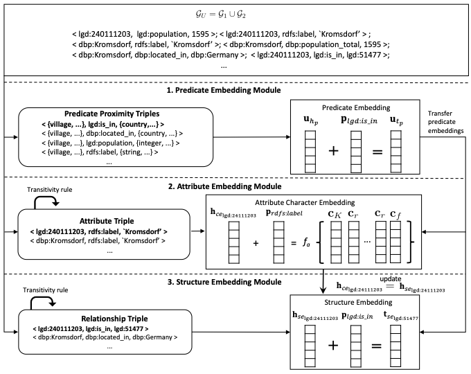 - **谓词嵌入模块:**使用谓词邻近图和类型对齐技术,将不同知识图谱中相似的谓词映射到相似的嵌入空间。