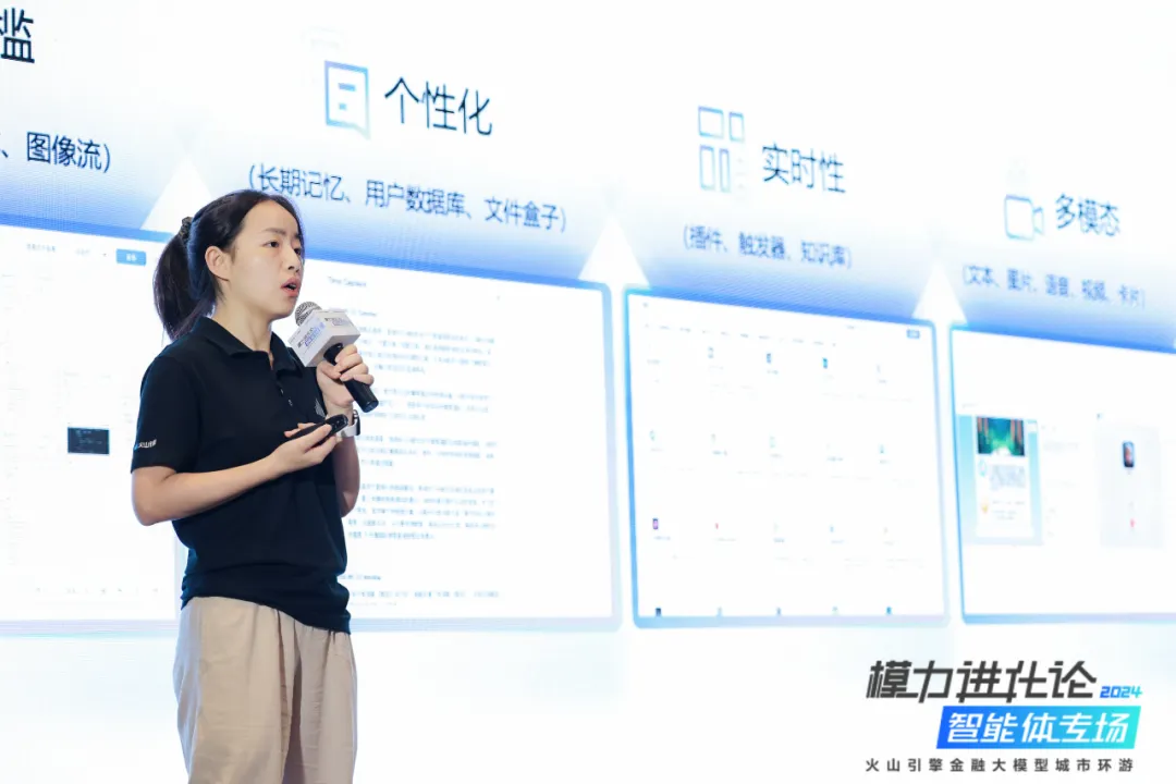 推动智能体技术的长效发展,需要依赖于更智能的模型、更强大的算力和更完善的工具和平台,火山引擎金融行业解决方案总监周思霁在分享中提到,扣子平台拥有低门槛、个性化、实时数据查询和多模态交互等能力,使得智能体的构建和应用变得更加简单和高效。