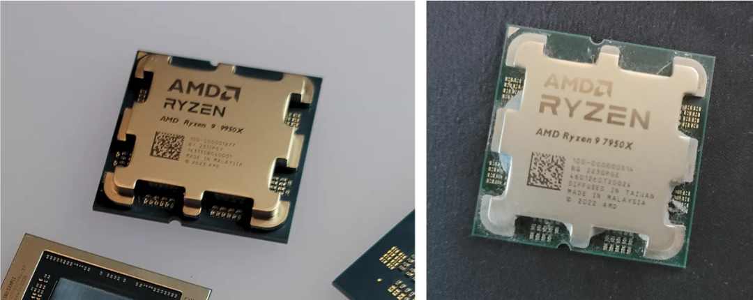 现在看来,AMD 芯片的印刷问题可能早已显露端倪。海外媒体 tomsHardware 的记者拿出了在 Zen 5 技术日拍摄的 Ryzen 9 9950X 的照片,与已经上市两年的 Ryzen 9 7950X 进行了对比,不难看出,「Ryzen 9 9950X」的每个单词之间的间距似乎比 AMD 奉行多年的标准都要更宽。