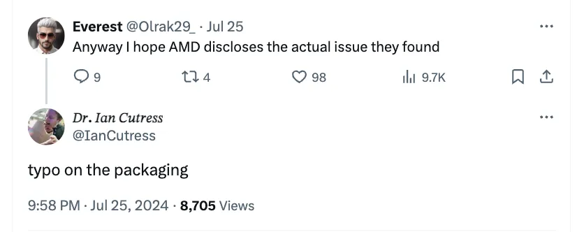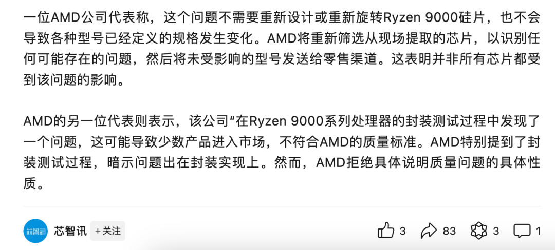 根据 Jack Huynh 的发言,也引申出了另一个版本的故事:AMD 透露这次事件并不是 CPU 微架构的问题,因此不需重新设计或重新制造 Ryzen 9000 芯片,也不需改变已经定义的各型号规格。问题出在封装测试的流程,导致筛选过程中可能会令不良品通过测试。这次的延迟是出于谨慎考虑,旨在保证每个 Ryzen 用户都能获得最佳使用体验。避免类似 Intel 13、14 代处理器大规模崩溃问题重演。