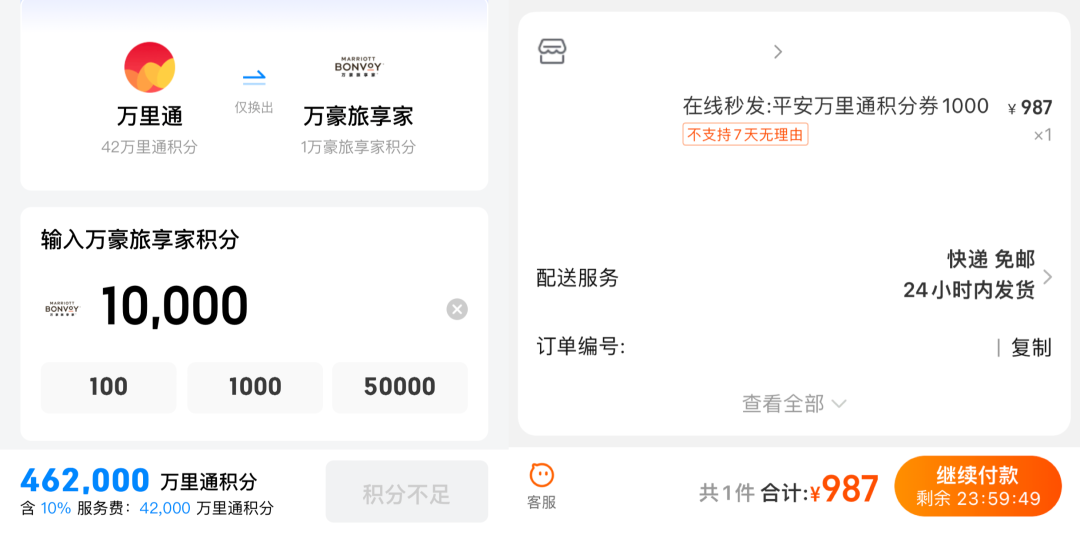 平安万里通积分转万豪积分有100%加赠,万豪积分获取成本约460元/万分(最多赠送30万分)。