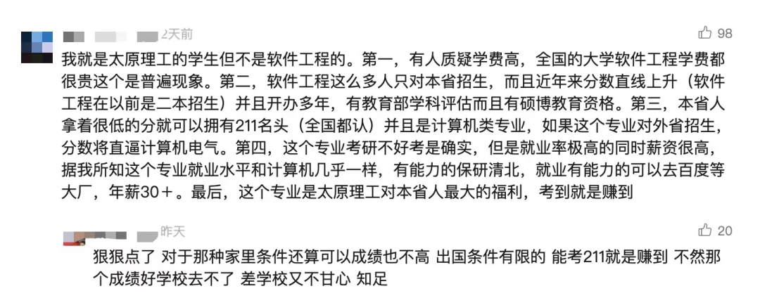 还有在读学生现身说法,相对高昂的学费放眼全国是普遍现象,教学质量有国家背书,最重要的是,对于「本省人」来说,花相对较高的学费获得了「211 title」与好专业(这两项无疑是就业简历上最重要的元素),只能说是捡到大便宜了,又怎么能认为是不划算的买卖呢?