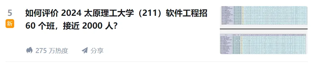 刚刚,「2024 太原理工大学(211)软件工程招 60 个班,接近 2k 人」的这条消息登上知乎热榜,讨论量居高不下。
