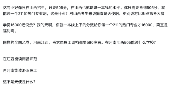 太原理工大学作为山西省唯一的一所 211 院校、唯二的双一流大学,承担着无数山西家长的希望,也肩负着山西考生的前途命运。为了保护本地考生,很多高校会把热门的好专业多留些名额给本地的学生。