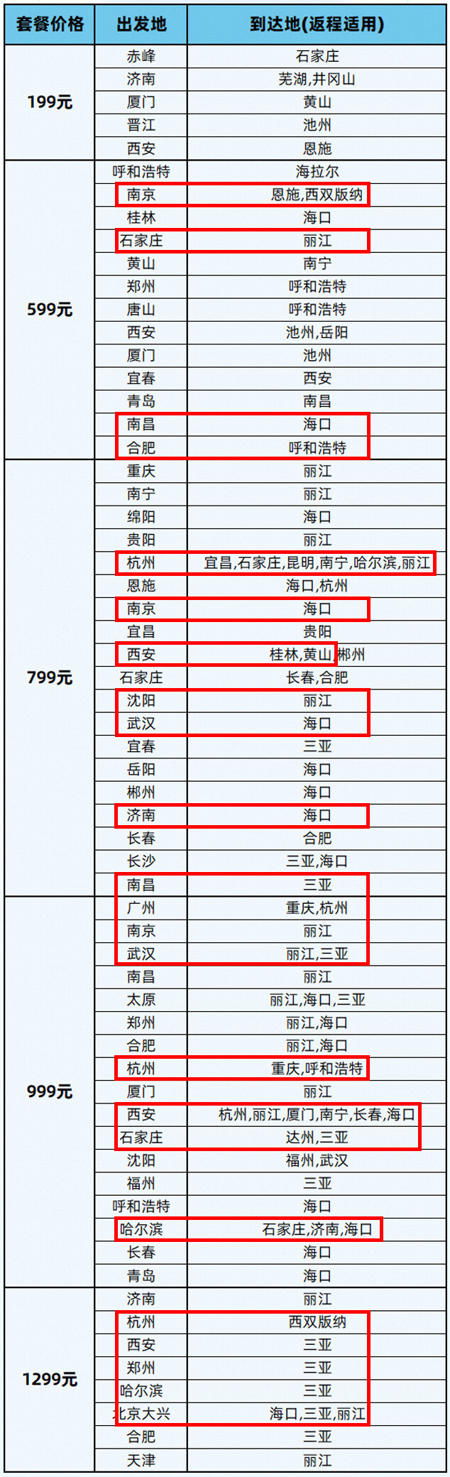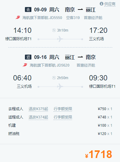 比如999的 南京=丽江,同样是首都航空的无托运行李航班,9月份含税往返1718元,而这款往返卡才1219: