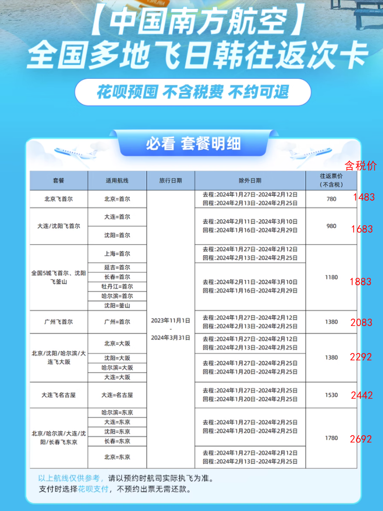2、南航多地往返东京/大阪/首尔,不含税780元起