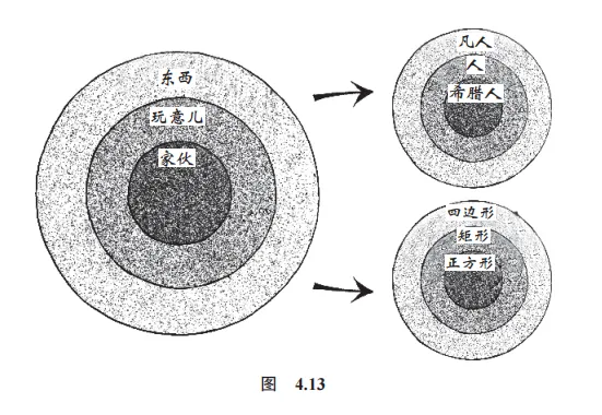 想象一下,有两个人正在看以上推理。对第一个人,我们告诉他“玩意儿 = 人,东西 = 凡人,家伙 = 希腊人”。对第二个人,我们告诉他“玩意儿 = 矩形,东西 = 四边形,家伙 = 正方形”。即使这两个人所说的不是同一件事,但他们都会同意这个三段论的说法。我们面对的就是一个误解(图 4.13)。