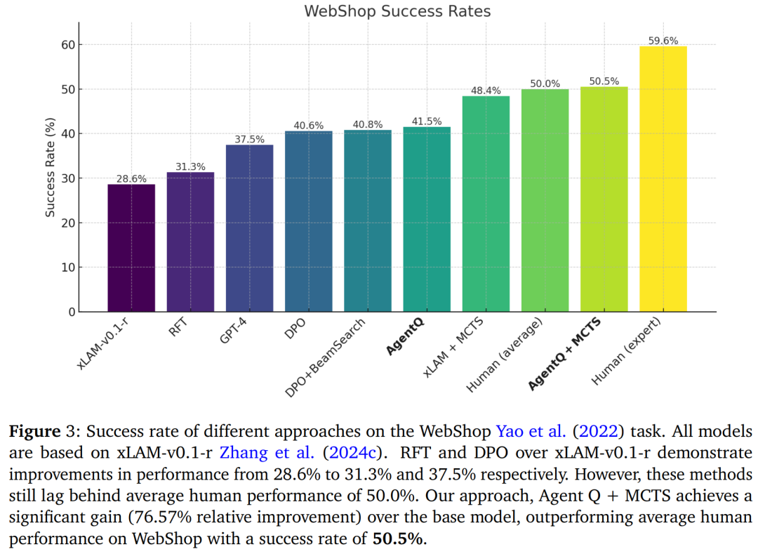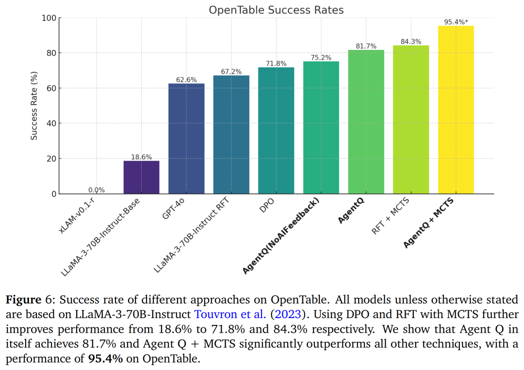 与此同时,作为拥有规划和 AI 自我修复功能的下一代 AI 智能体,Agent Q 的性能是 LLama 3 基线零样本性能的 3.4 倍。同时,在真实场景任务的评估中,Agent Q 的成功率达到了 95.4%。