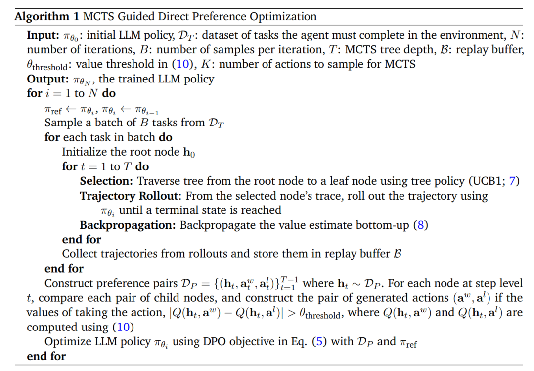 直接偏好优化(DPO):该算法通过从 MCTS 生成的数据构建偏好对以微调模型。这种离策略训练方法允许模型从聚合数据集(包括搜索过程中探索的次优分支)中有效地学习,从而提高复杂环境中的成功率。